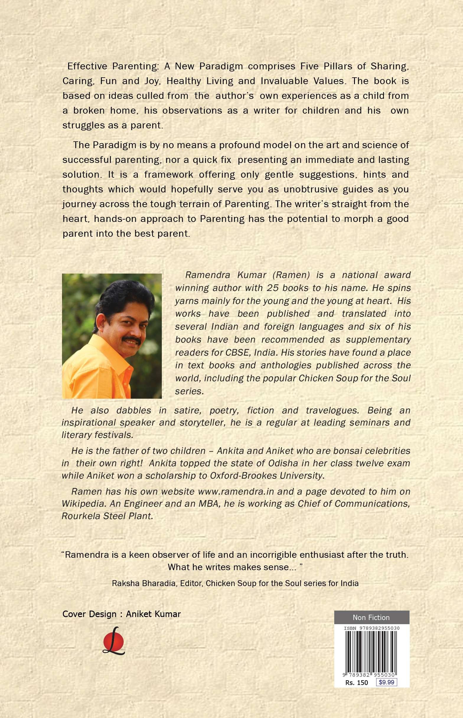 Effective Parenting: A New Paradigm comprises Five Pillars of Sharing, Caring, Fun and Joy, Healthy Living and Invaluable Values. The book is based on ideas culled by experiences of Ramendra Kumar as a child from a broken home, his observations as a writer for children and his own struggles as a parent. The Paradigm is by no means a profound model on the art and science of successful parenting, nor a quick fix presenting an immediate and lasting solution. It is a framework offering only gentle suggestions, hints and thoughts which would hopefully serve as unobtrusive guides as you journey across the tough terrain of Parenting.