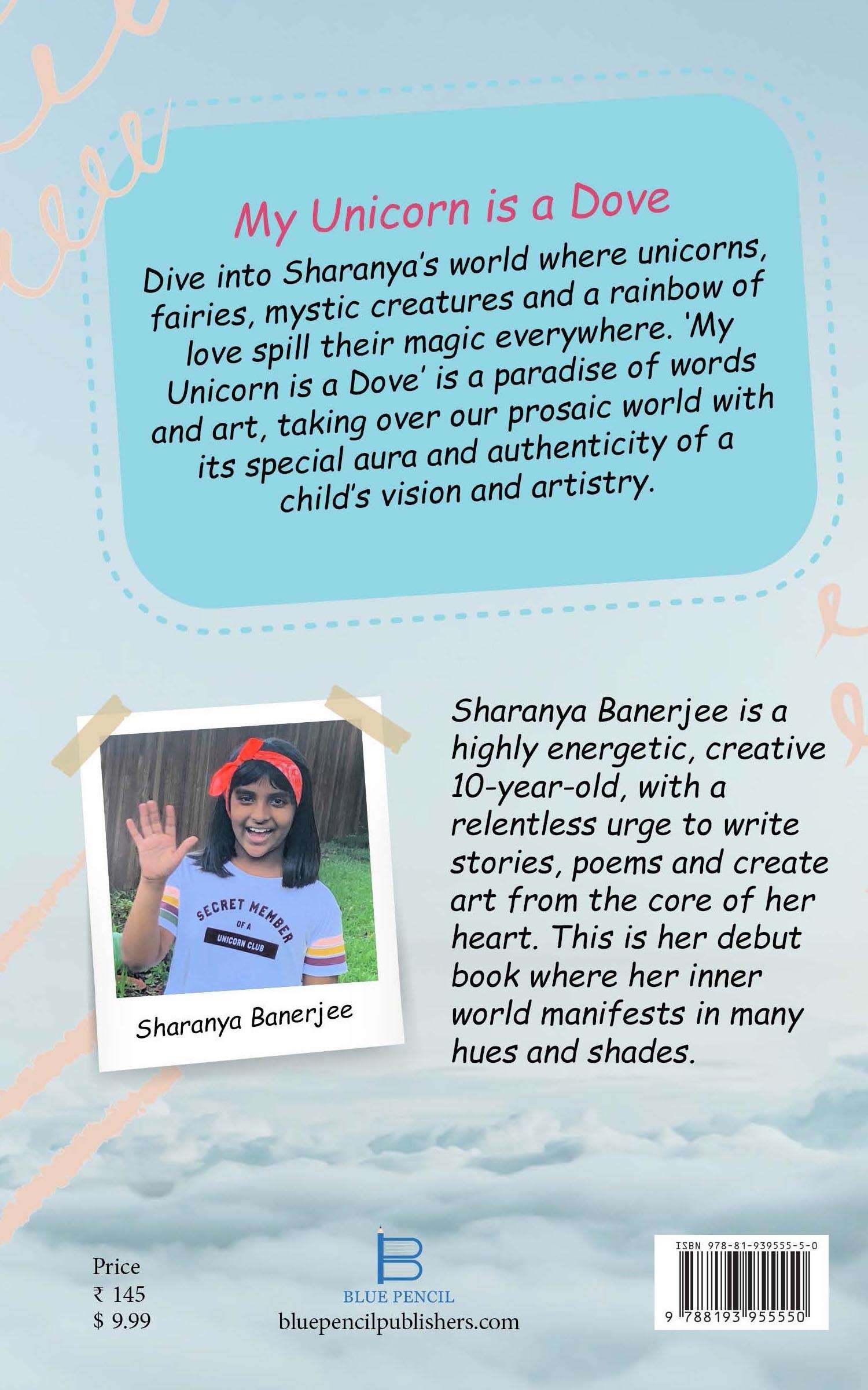 Dive into Sharanya’s world where unicorns, fairies, mystic creatures and a rainbow of love spill their magic everywhere. ‘My Unicorn is a Dove’ is a paradise of words and art, taking over our prosaic world with its special aura and authenticity of a child’s vision and artistry.